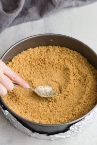 3, Keksikovu směs smícháme na pánvi s lupínky a máslem a hotovým základem vyplníme dno dortové formy. My jsme použili dortový kruh a talíř, abychom mohli dort rovnou na něm servírovat a nemuseli ji překládat. Základ zvykneme přitlačit skleničkou nebo lžičkou, abychom uhladily povrch. Zatímco si připravíme tvarohový krém, odložíme celou formu do chladničky.