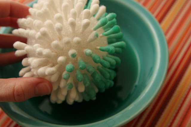 Ak budete mať pokrytú celú guľu, zmiešajte do misky trochu vody a potravinárskeho farbiva. Konce tyčiniek máčajte tak , aby boli všetky tyčinky rovnako nafarbené. Potom guľu položte na uterák, aby vyschla. Farba sa zosvetlí.