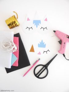 - Odměříme vhodné množství gumy, které jsou akorát pro naše malých jednorožců a horkým lepidlem ji přilepíme na zadní stranu masky