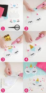 - Vytlačíme si šablony potřebné na jednorožce. Přiložíme k plsti potřebné barvy a vystřihneme.