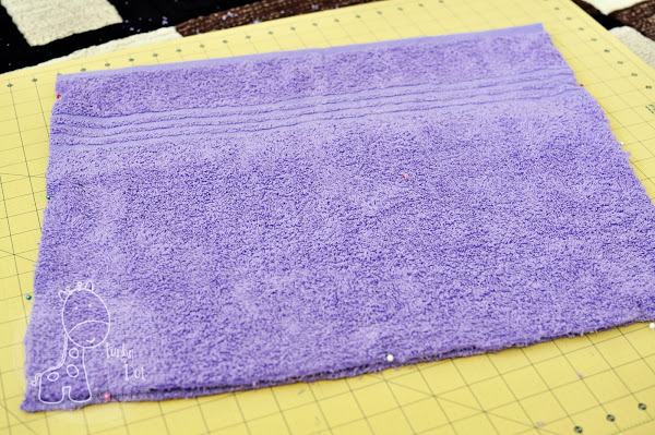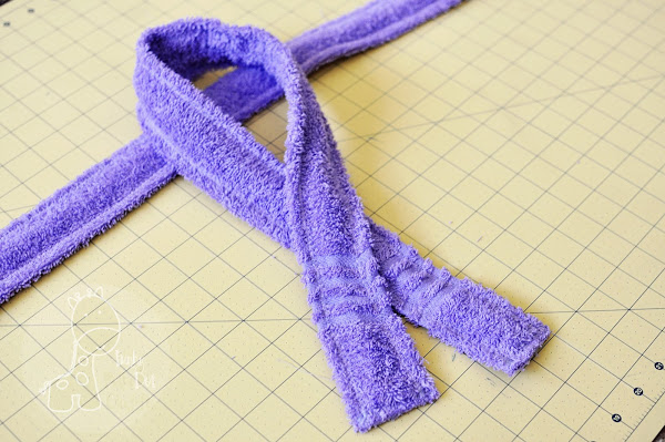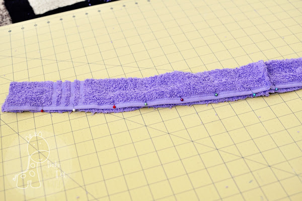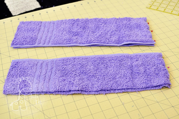 3. Zoberte si kúsky čo ste obstrihali z kratších strán uteráku. Položte ich na zem do dvoch dvojíc. Každú potom zošite na jednej z ich krátkej strany.