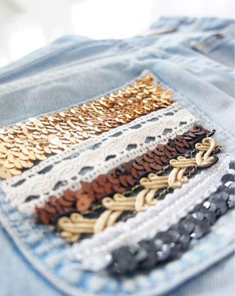 1. Šortky si otočíme zadným vreckami smerom nahor. Zvolíme si vrecko, pravé/ľavé, na ktoré budeme dekorácie aplikovať.