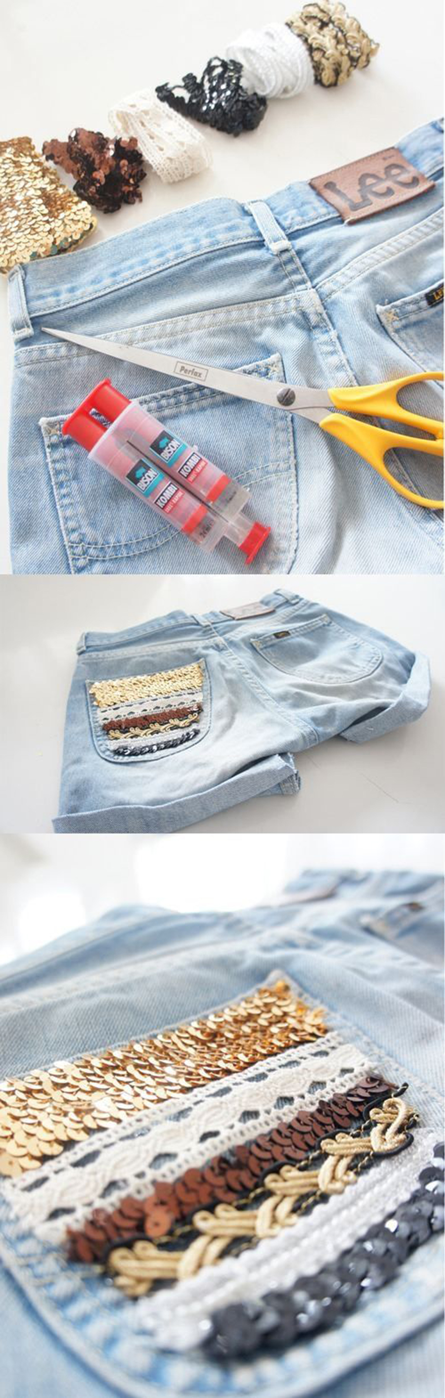 3. V poslednom kroku v bodoch postupne po jednom dekoračné pásy nalepujeme na zvolené zadné vrecko šortiek.