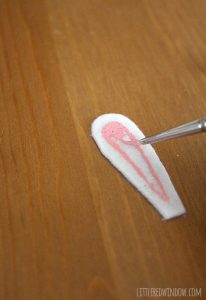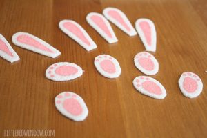Ako prvé si z bielej plsti, prípadne z kartónu, vystrihneme tvar zajačích ušiek, približne 3 a pol cm dlhých.