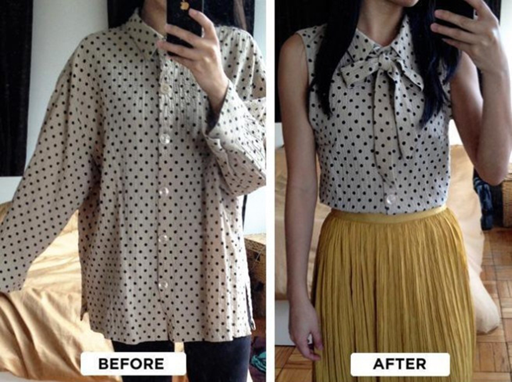 - Na začátku je třeba upravit šířku košile a popřípadě, pokud na košili jsou rukávy, odstřihnout jejich. Tak pojďme na to.